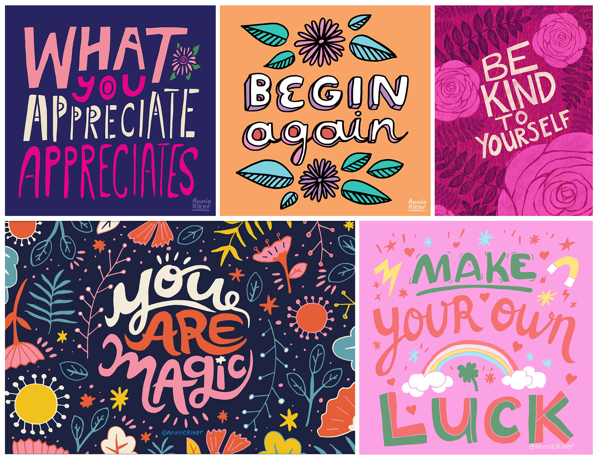 Annie's artwork is often described as cheerful, encouraging, and feel-good. Her natural joy shines through in her hand-lettering design. Annie's strong connection to her intuition guides her creative process.
