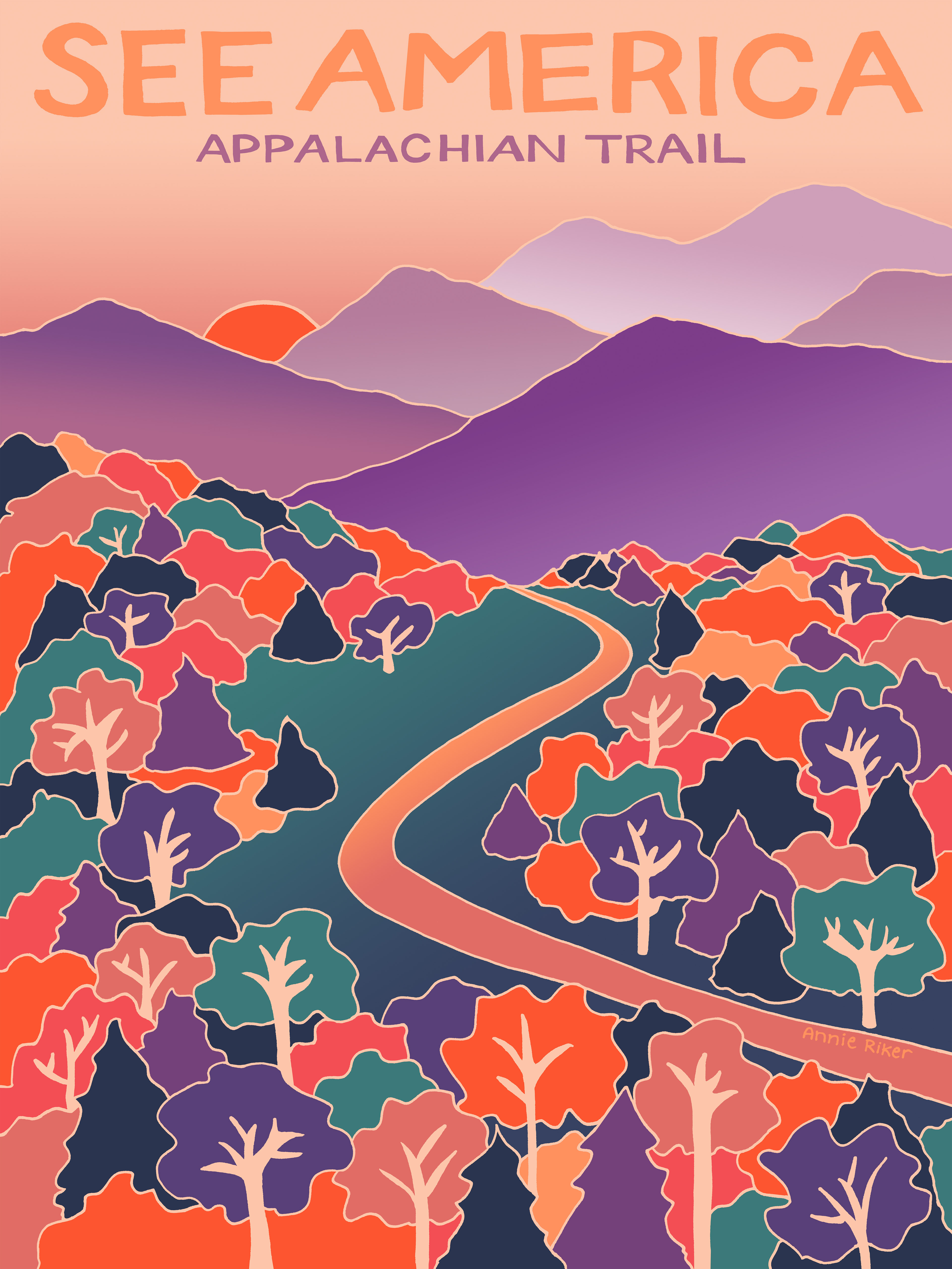 Max Patch, a stretch of mountain meadow along the Appalachian Trail, was the first hike we did as a family after moving to Asheville, NC. It’s about an hour drive from our house to the trailhead, and a short hike up the mountain. It was fall, so the colors of the trees below us looked like a beautiful patchwork quilt. And the 360-degree views of mountains all around were incredible. We sat up there for hours nibbling on the snacks we had packed while watching kids with kites and a few Appalachian Trail thru-hikers pass by. The beautiful views and the on-top-of-the-world feeling was something I wanted to capture in creating this poster.